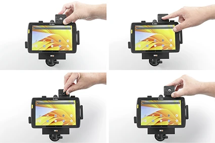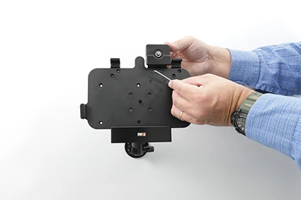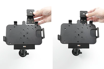 To place the device in the holder: Place the lower part of the device in the holder, then flip/press the upper part forward so it snaps into place in the holder. Push the lock block downward and press the button to lock. To remove the device from the holder: Use the enclosed key to open the lock. Slide the lock block upward. Press upwards on the upper part of the holder, in the same time pull the upper part of the device out from the holder and then lift the device up and out from the holder.