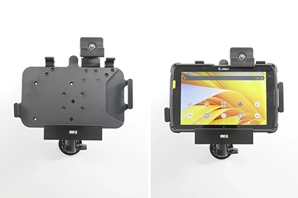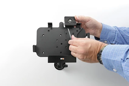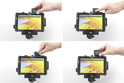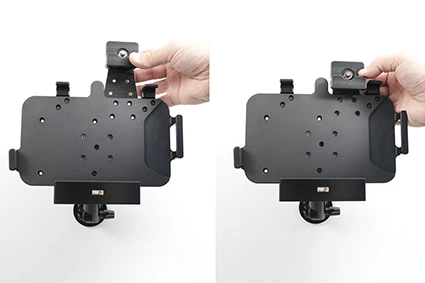 To place the device in the holder: Place the lower part of the device in the holder, then flip/press the upper part forward so it snaps into place in the holder. Push the lock block downward and press the button to lock. To remove the device from the holder: Use the enclosed key to open the lock. Slide the lock block upward. Press upwards on the upper part of the holder, in the same time pull the upper part of the device out from the holder and then lift the device up and out from the holder.