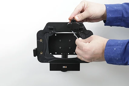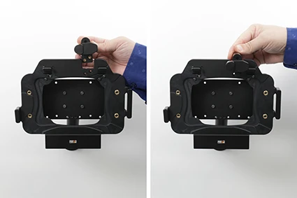 To place the device in the holder: Place the lower part of the device in the holder, then flip/press the upper part forward so it snaps into place in the holder. Push the lock block downward. To remove the device from the holder: Slide the lock block upward. Press upwards on the upper part of the holder, in the same time pull the upper part of the device out from the holder and then lift the device up and out from the holder.