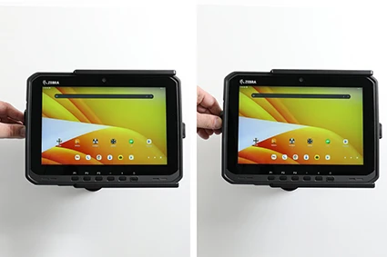 To place the device in the holder: Slide the device sideways carefully into the holder. Push the lock block downward. To remove the device from the holder: Slide the lock block upward.