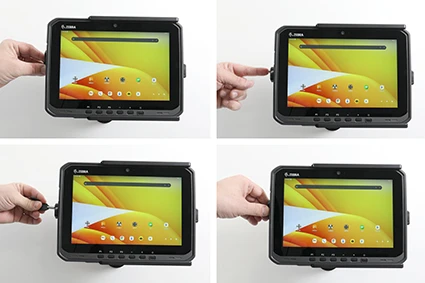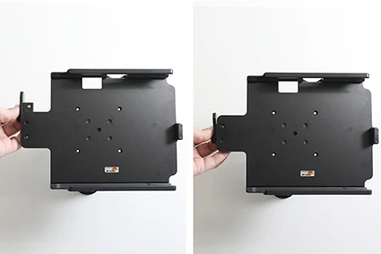 Slide the device sideways carefully into the holder. Press the lock sideways onto the left part of the holder. Press the button to lock. Use the enclosed key to open the lock. Remove the lock by slidning it sideways away from the holder. Slide the device sideways out of the holder.