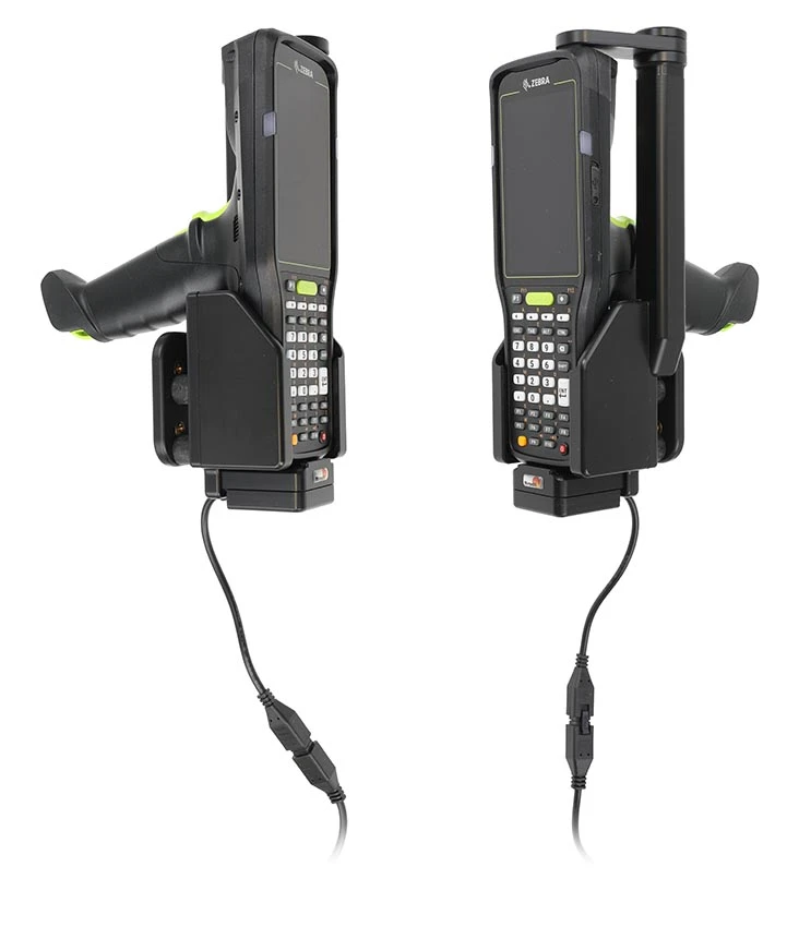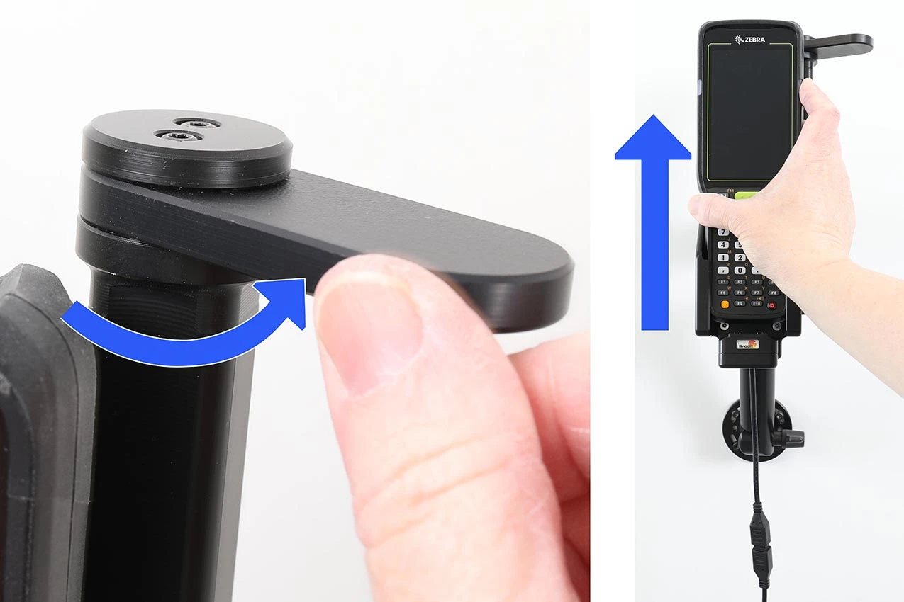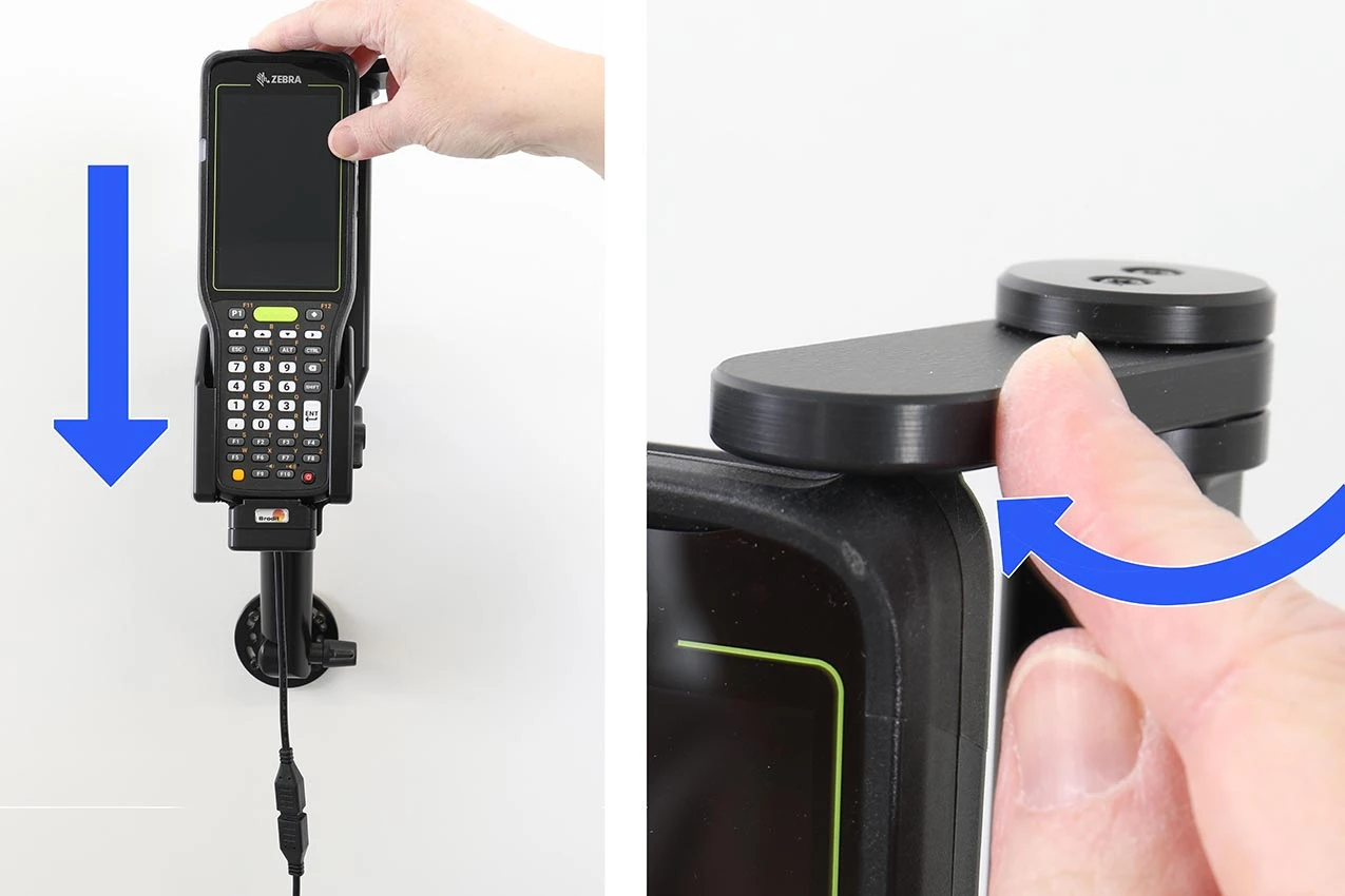 The choice for you who want to have you PDA firmly in place, properly attached and still within easy reach. The holder has a strong, robust design to withstand rough handling in professional use. The swiveling top part keeps your device extra securely in place in the holder, it "locks" the device in the holder so that it can not shake the least. It is easy to place the PDA in the holder, and to take it with you when leaving the vehicle. The charging device is automatically connected when you put the device in the holder. The rubber vibration dampeners help to eliminate vibrations when mounted onto a vehicle operating in rough road conditions.