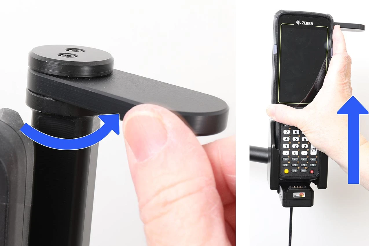 To remove the device from the holder: Turn the swiveling top sideways so the device is set free. Lift the device straight upward, out from the holder.