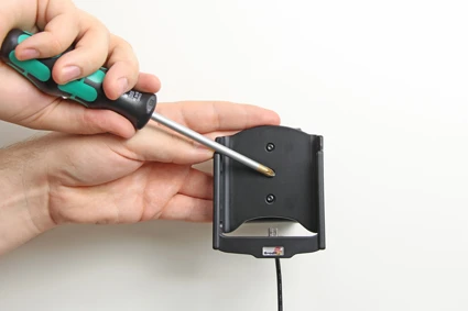 Connect the White wire to a Negative Ground connection of the vehicle or the vehicle chassis. 2. Connect the Red wire to a 12/24 Volt power supply in the vehicle that is controlled by the ignition switch of the vehicle. How to mount the holder: 1. Loosen the screw in the center of the holder so you can remove the tilt swivel attaching plate on the back. 2. Place the attaching plate onto the desired position. Screw the attaching plate into place with the enclosed screws. 3. Place the holder over the attaching plate so the screw fits in the hole in the tilt swivel. Screw a few turns on the screw, just so the thread starts to pull. Pull the holder toward you and hold it slightly tensed, in the same time tighten the screw so the holder is pulled toward the tilt swivel. Tighten the screw firm at first, then loosen it a bit so the holder is firmly in place, but still can be adjusted. 4. The holder is in place.
