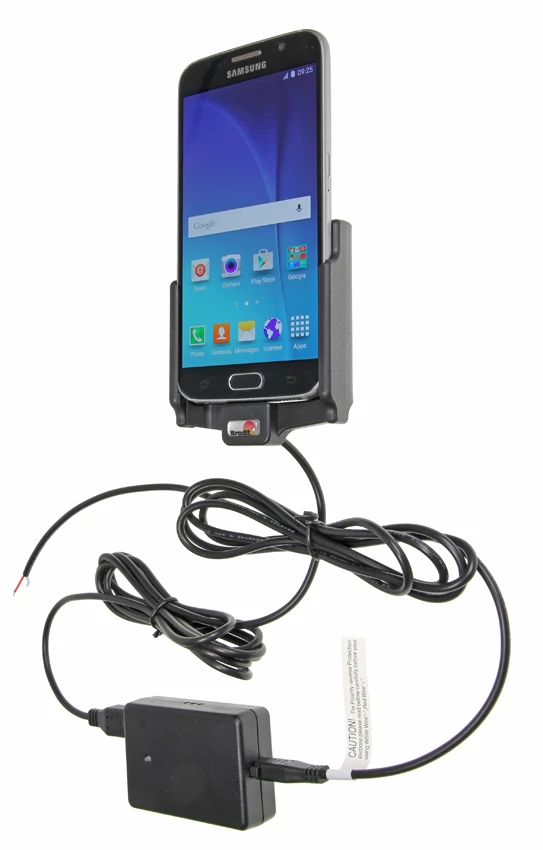 With Molex adapter system. You can choose to use the holder as an active holder for charging of your device only, or to connect an adapter to the Molex connector for additional features. Then you can use the holder also for power supply of a GPS receiver or other own solutions (can not be used for data communication or audio connection).
