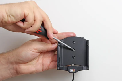 Connect the White wire to a Negative Ground connection of the vehicle or the vehicle chassis. 2. Connect the Red wire to a 12/24 Volt power supply in the vehicle that is controlled by the ignition switch of the vehicle. How to mount the holder: 1. Loosen the screw in the center of the holder so you can remove the tilt swivel attaching plate on the back. 2. Place the attaching plate onto the desired position. 3. Screw the attaching plate into place with the enclosed screws. Place the holder over the attaching plate so the screw fits in the hole in the tilt swivel. Screw a few turns on the screw, just so the thread starts to pull. Pull the holder toward you and hold it slightly tensed, in the same time tighten the screw so the holder is pulled toward the tilt swivel. Tighten the screw until the holder is firmly in place, but still can be adjusted. 4. The holder is in place.