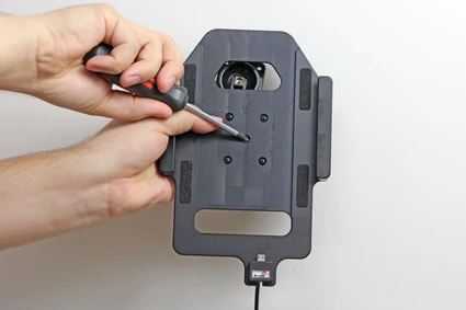 Connect the White wire to a Negative Ground connection of the vehicle or the vehicle chassis. 2. Connect the Red wire to a 12/24 Volt power supply in the vehicle that is controlled by the ignition switch of the vehicle. Installation of the holder: Please read all of the instructions and look at the pictures before attaching the holder. 1. Loosen the screw in the center of the holder so you can remove the tilt swivel attaching plate on the back. 2. Place the attaching plate onto the desired position. 3. Screw the attaching plate into place with the enclosed screws. Place the holder over the attaching plate so the screw fits in the hole in the tilt swivel. Tighten the screw until the holder is firmly in place, but still can be adjusted. 4. The holder is in place in upright and horizontal position.