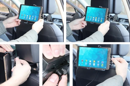 Tablets should not be installed onto a car’s dashboard. They may block the view or key controls and the ProClip is designed for installation of smaller devices (phones), not for large devices (tablets). Brodit will not give any recommendations for such installations. An installation of a tablet onto a vehicle’s dashboard is always done on the customer’s own responsibility. Brodit recommends to use tablets in a holder on the car’s headrest, installed onto a Brodit headrest mount.