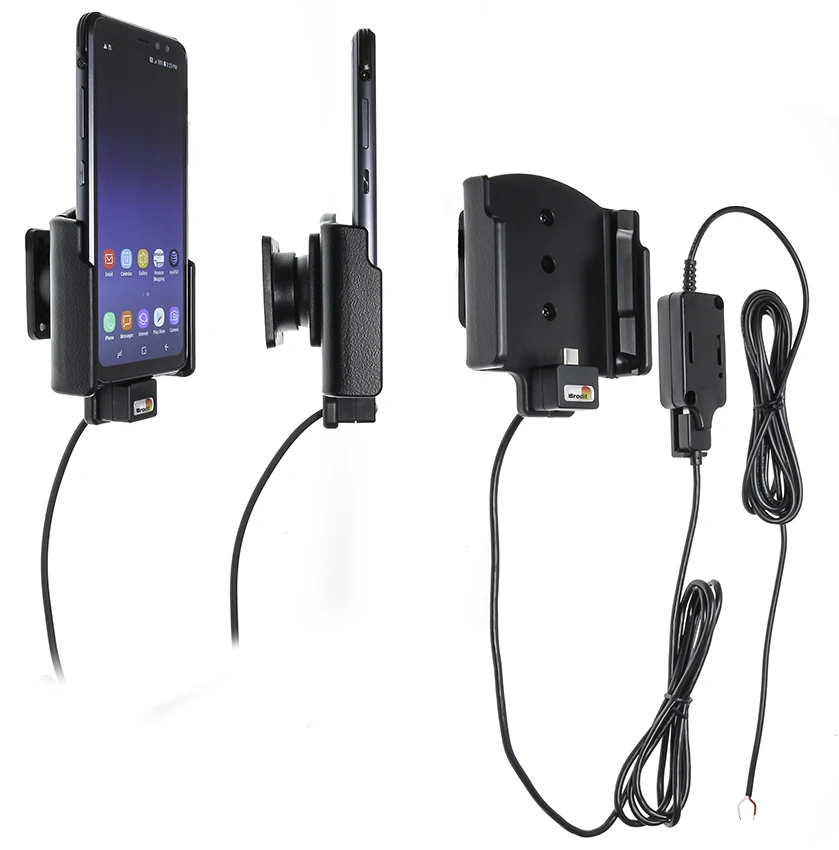 When you place the Samsung Galaxy S8 in the holder, it automatically connects to the charging unit. 12 Volt. The product is E-approved. Connect the power cable with a 2 A fuse. Professional installation recommended.