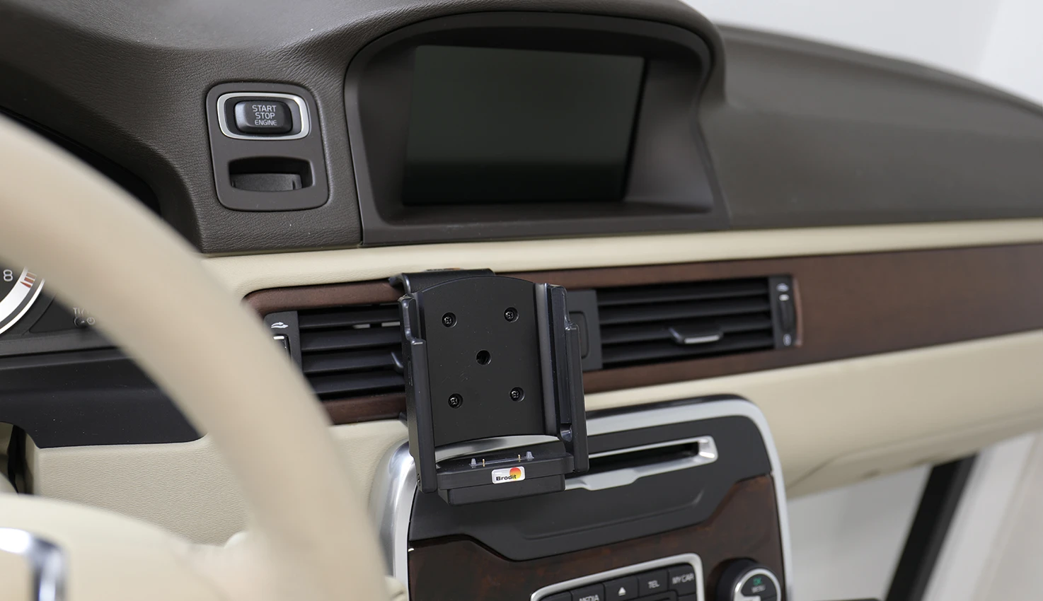 An active holder which is to be connected inside the dashboard, this gives a discreet, neat installation without cables hanging over the interior!