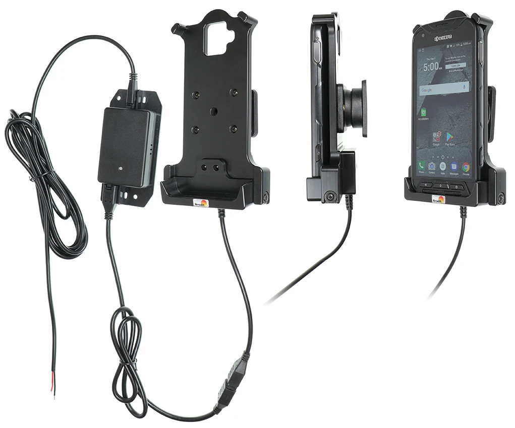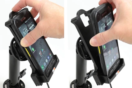 Extra robust holder, designed to withstand rough working conditions in everyday professional use. Customized holder with a very secure hold and unimpaired charging thanks to the 3-point hold feature. Soft connection to the charging pins which are hidden for protection from frequent wear and breakage. Easy insert/removal of the device in the holder. Discreet design.