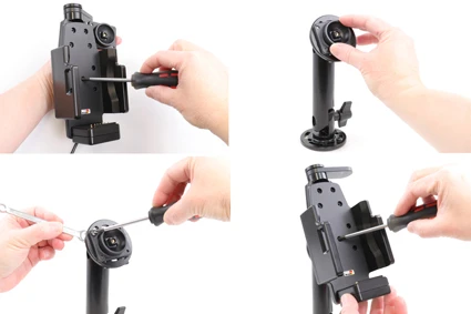 Loosen the screw in the center of the holder so you can remove the tilt swivel attaching plate on the back. Place the attaching plate onto the desired position. Screw the attaching plate into place with the enclosed screws. Place the holder over the attaching plate so the screw fits in the hole in the tilt swivel. Tighten the screw until the holder is firmly in place, but still can be adjusted.