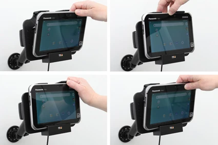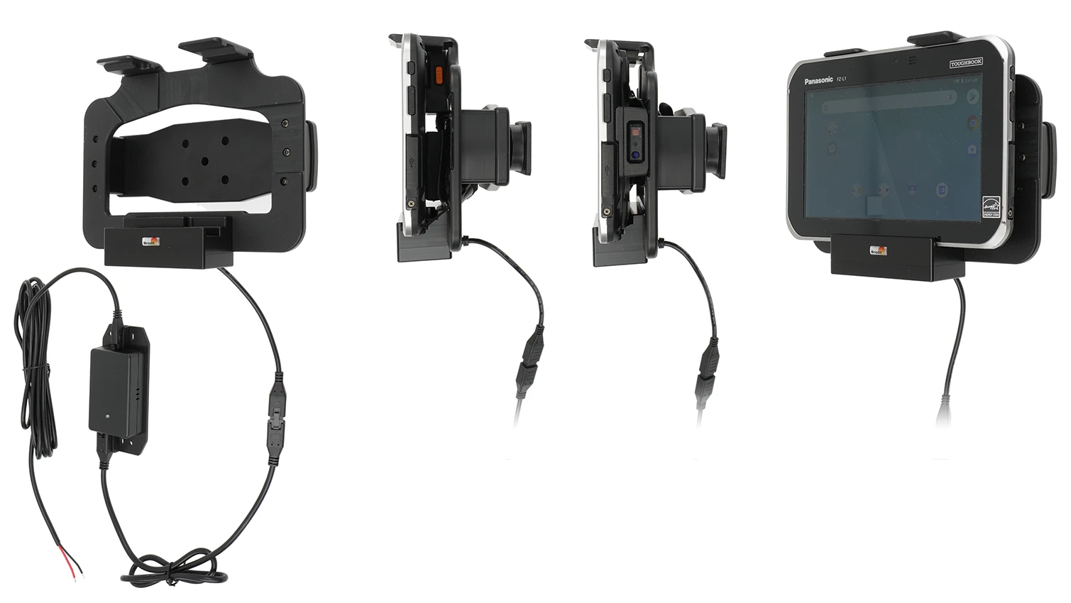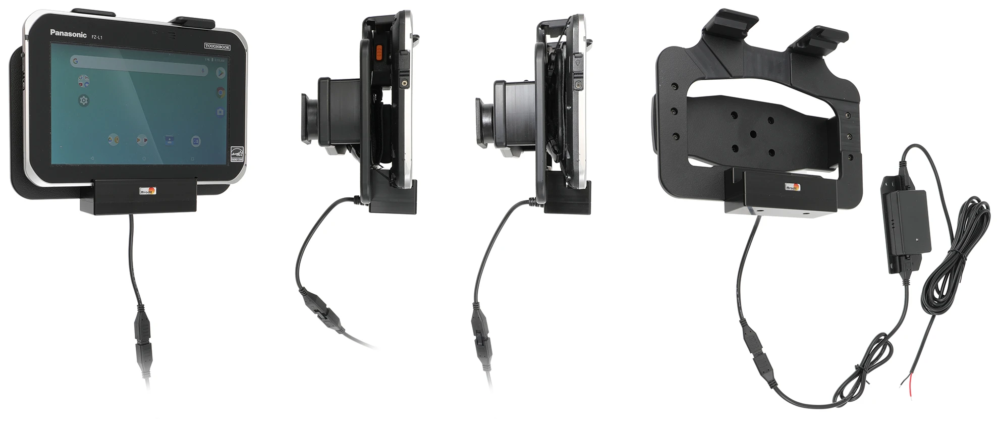 Use an active holder for your Panasonic while driving and you will always have a freshly charged battery! The holder provides a neat and comfortable installation - safe and convenient. Customized holder with a perfect fit for device with scanner frame and handstrap. The active holder is to be connected inside the dashboard. It provides a discreet and neat installation without any cables hanging over the interior. 12/24 Volt. The product is E-approved. Connect the power cable with a 2 A fuse. 2 A charger. Charging via pogo plug. Professional installation recommended.