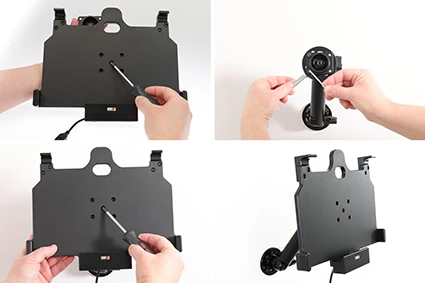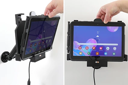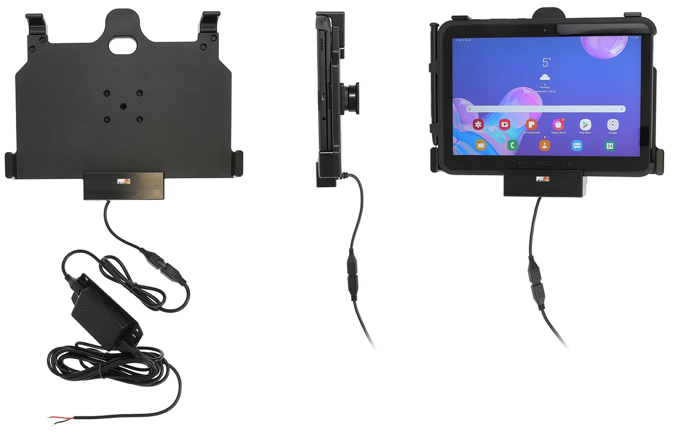 Use an active holder for your Galaxy Tab Active Pro while driving and you will always have a freshly charged battery! The active holder is to be connected inside the dashboard. It provides a discreet and neat installation without any cables hanging over the interior. Safe and convenient! 12/24 Volt. The product is E-approved. Connect the power cable with a 2 A fuse. 2.7 A charger. Charging via pogo plug. Professional installation recommended.