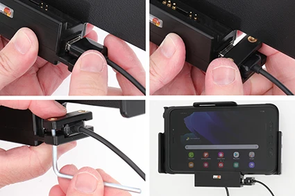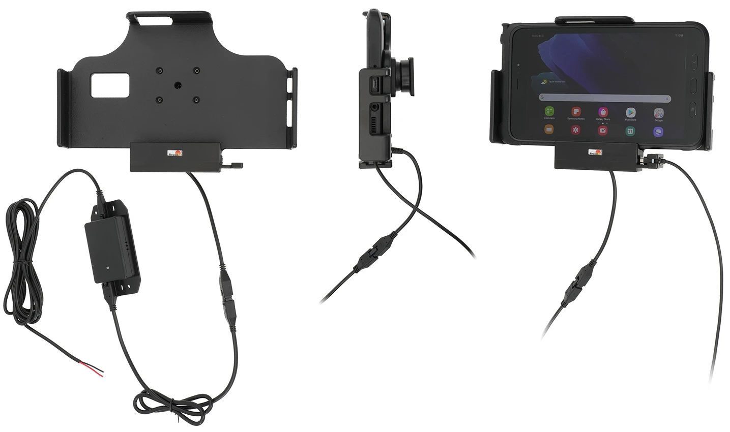 Use an active holder for your Galaxy Tab Active while driving and you will always have a freshly charged battery! The active holder is to be connected inside the dashboard. It provides a discreet and neat installation without any cables hanging over the interior. Safe and convenient! 12/24 Volt. The product is E-approved. Connect the power cable with a 2A fuse. 2,7A charger. Charging via pogo plug. Professional installation recommended. The holder is equipped with a USB-Host port so you can connect an accessory.