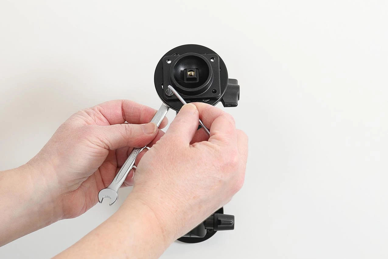 Place the holder over the attaching plate so the screw fits in the hole in the tilt swivel and screw it into place. Tighten the screw so the holder is firmly in place, but still can be adjusted.