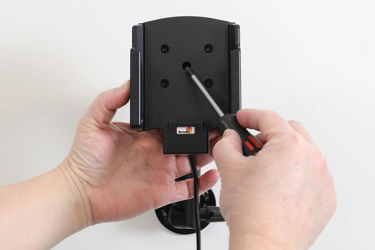 The holder is equipped with a tilt swivel so you can easily adjust the angle for better viewing, or switch between portrait and landscape mode. Tilts 17° and swivels 360°. Mounting plate 42x50 mm with 4 mm AMPS-holes. Made of high grade black ABS/Acetal plastic. Made in Sweden. Connect the power cable with a 3A fuse. Professional installation recommended. Attach onto a ProClip Mounting Platform or a Pedestal Mount.