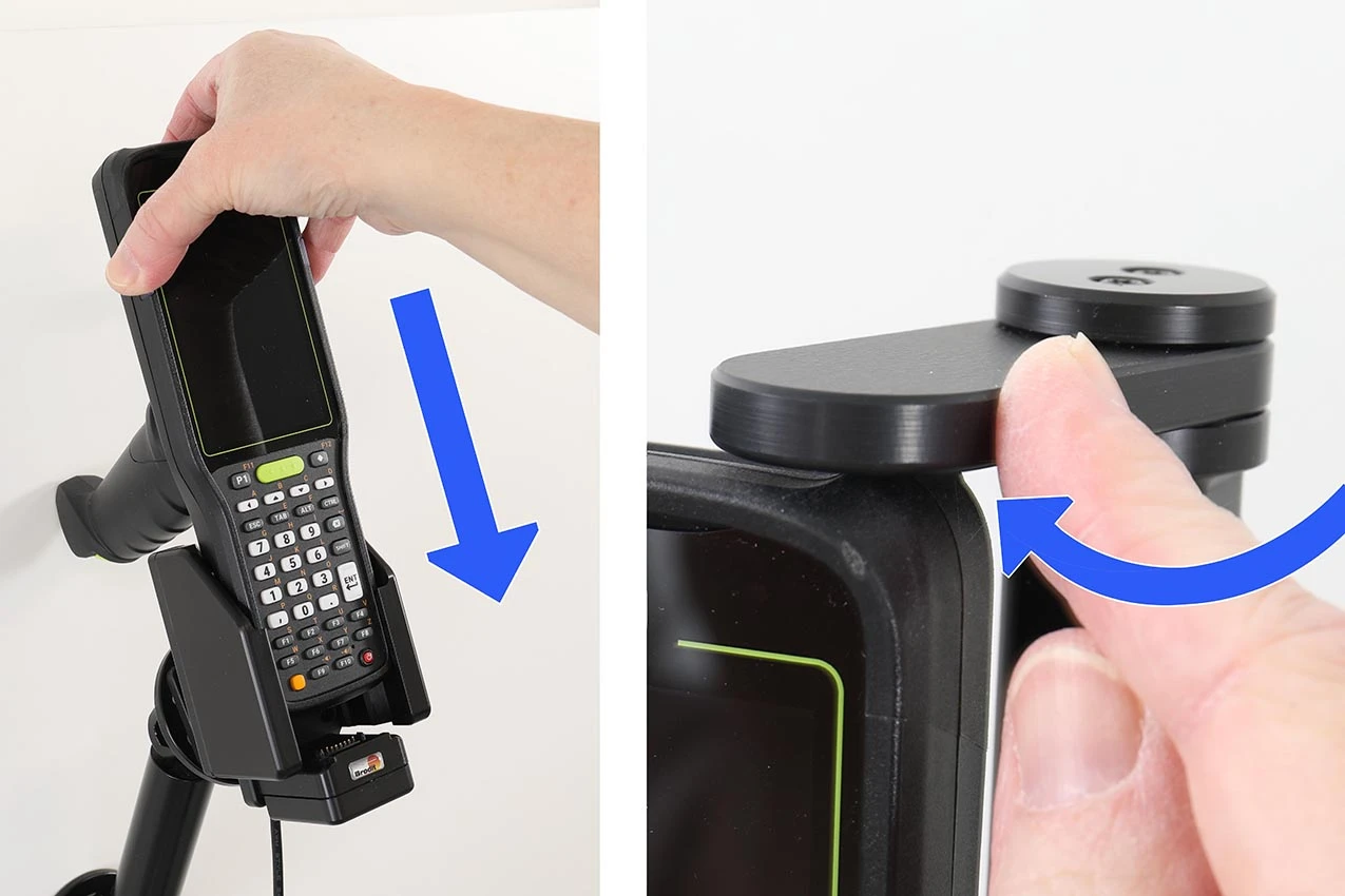 To place the device in the holder: Hold the device over the holder and slide it straight downward into the holder. Turn the swiveling top over the device.