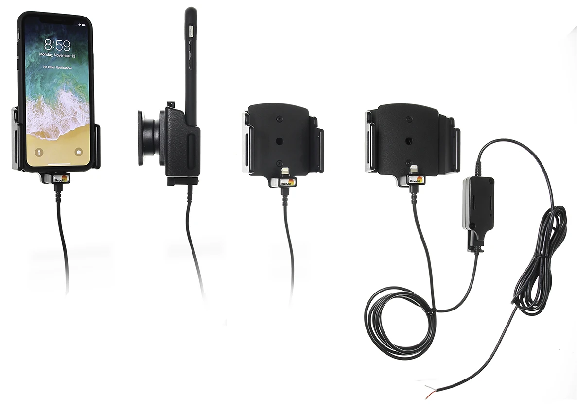 When you place the iPhone in the holder, it automatically connects to the charging unit. 12 Volt. The product is E-approved. Connect the power cable with a 2 A fuse. Professional installation recommended.