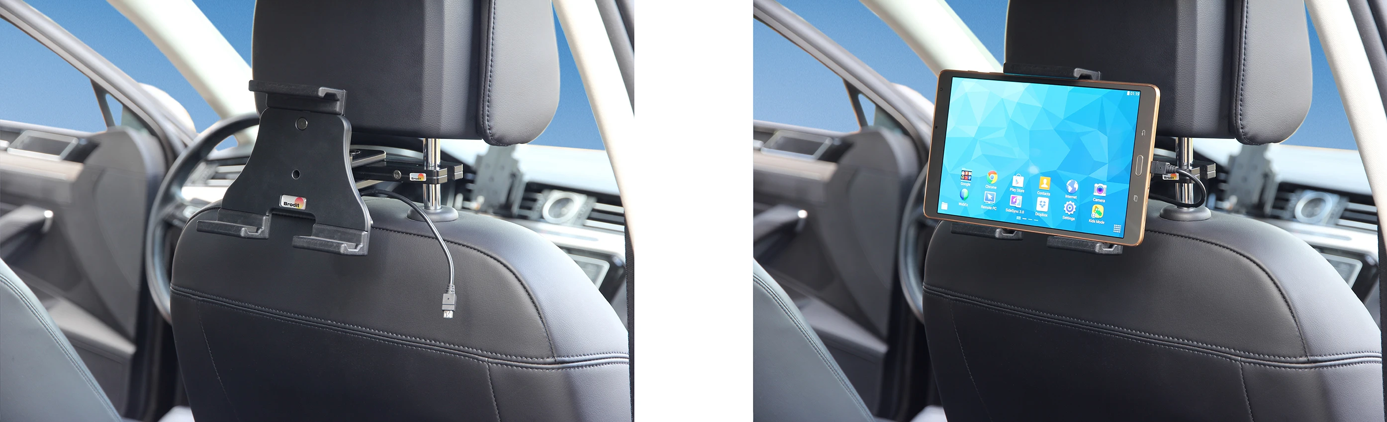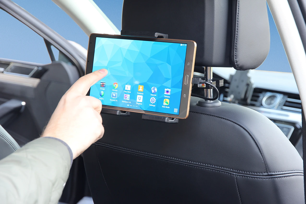 Tablets should not be installed onto a car’s dashboard. They may block the view or key controls and the ProClip is designed for installation of smaller devices (phones), not for large devices (tablets). Brodit will not give any recommendations for such installations. An installation of a tablet onto a vehicle’s dashboard is always done on the customer’s own responsibility. Brodit recommends to use tablets in a holder on the car’s headrest, installed onto a Brodit headrest mount.
