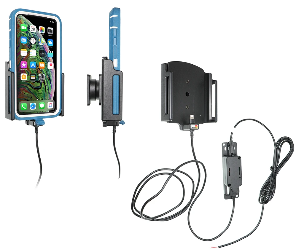 When you place the iPhone in the holder, it automatically connects to the charging unit. 12 Volt. The product is E-approved. Connect the power cable with a 2 A fuse. Professional installation recommended.