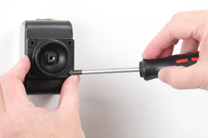 Place the holder over the attaching plate so the screw fits in the hole in the tilt swivel and screw it into place. Tighten the screw so the holder is firmly in place, but still can be adjusted.