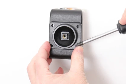 Place the holder over the attaching plate so the screw fits in the hole in the tilt swivel and screw it into place. Tighten the screw so the holder is firmly in place, but still can be adjusted.