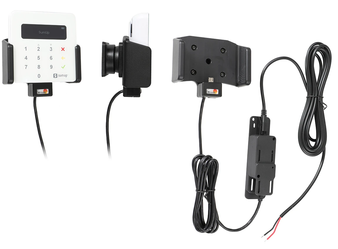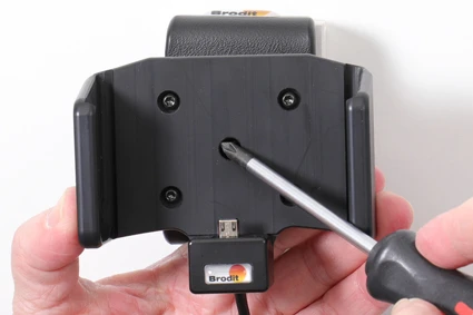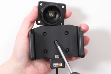 The holder is equipped with a tilt swivel so you can easily adjust the angle for better viewing. Tilts 17° and swivels 360°. Mounting plate 42x50 mm with 4 mm AMPS-holes. Made of high grade black ABS/Acetal plastic. Made in Sweden. Connect the power cable with a 2A fuse. Professional installation recommended. Attach onto a ProClip mounting platform or a Pedestal mount.