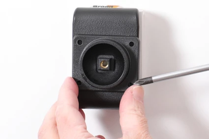 Place the holder over the attaching plate so the screw fits in the hole in the tilt swivel and screw it into place. Tighten the screw so the holder is firmly in place, but still can be adjusted.