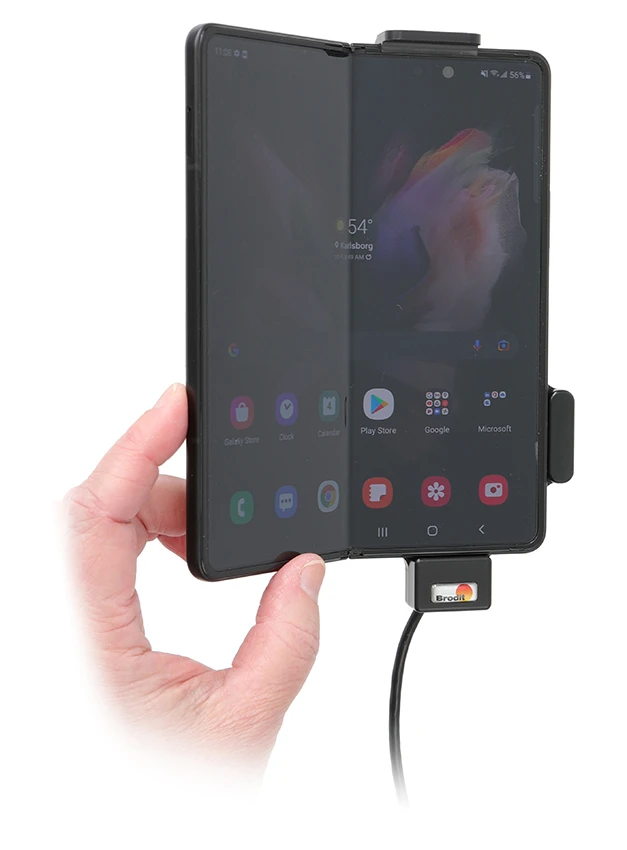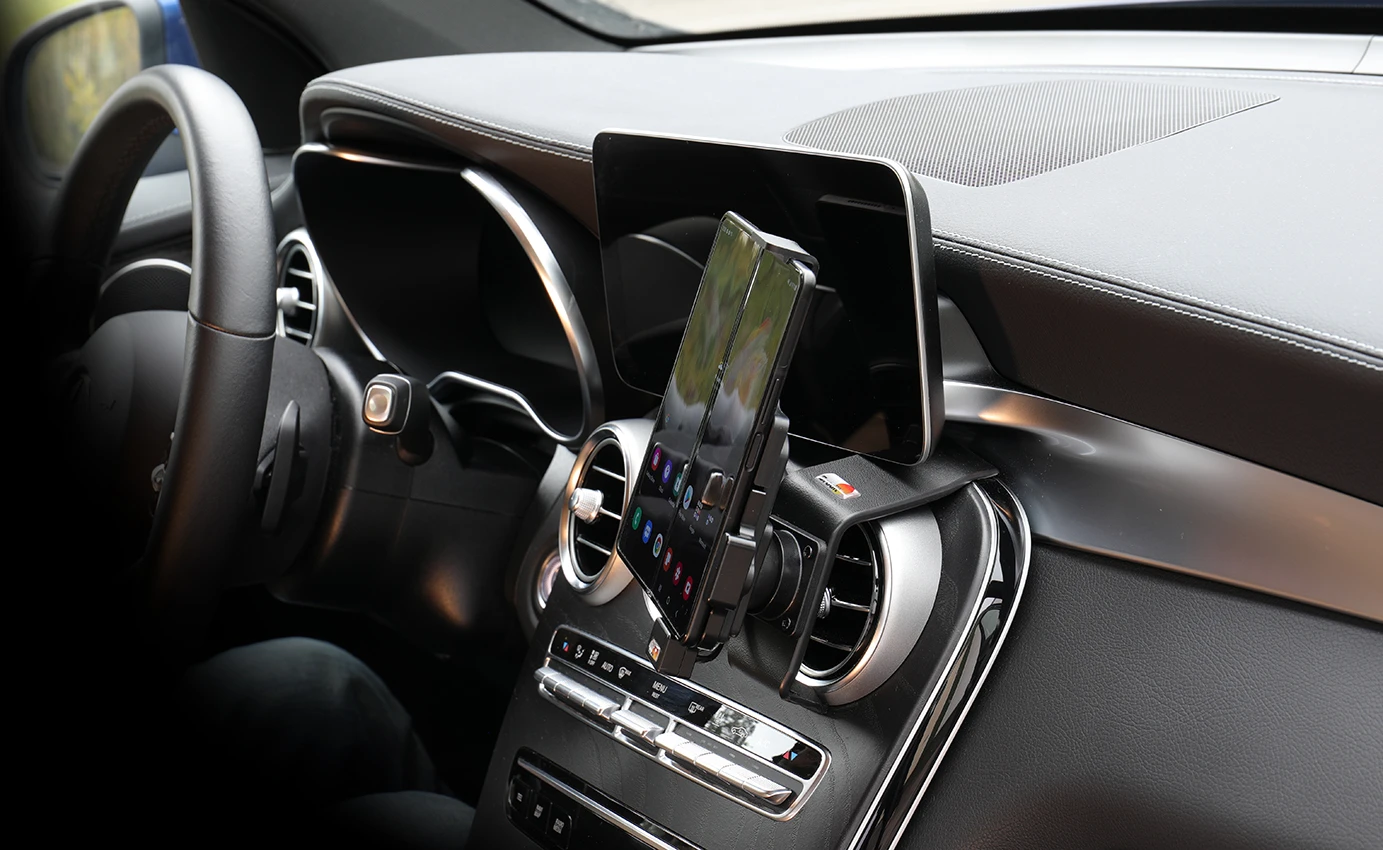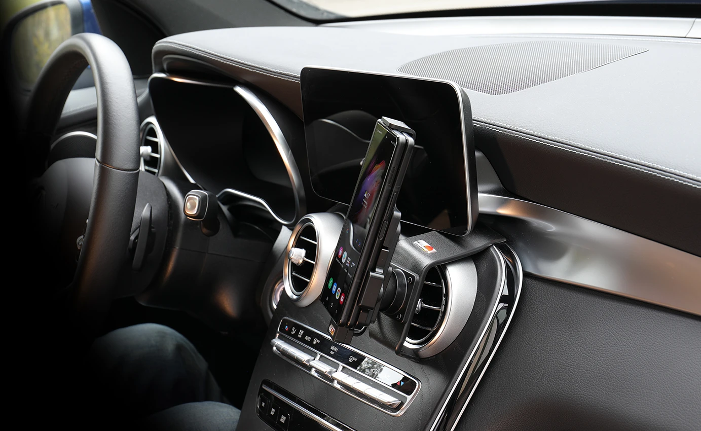 Keep your phone's battery fully charged in an active holder, always within easy sight and reach! Neat, discreet and convenient. Custom made with a perfect, firm fit. For fixed installation. The holder is to be connected inside the dashboard, providing an elegant installation without any cables hanging over the interior. The charging box has two USB-A ports: QC 3.0A + 2.4A. You have full access to the camera and all buttons when the device is in the holder. It is easy to slide the phone in place in the holder so it connects to the charging, and to take it out of the holder when leaving the vehicle.