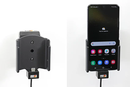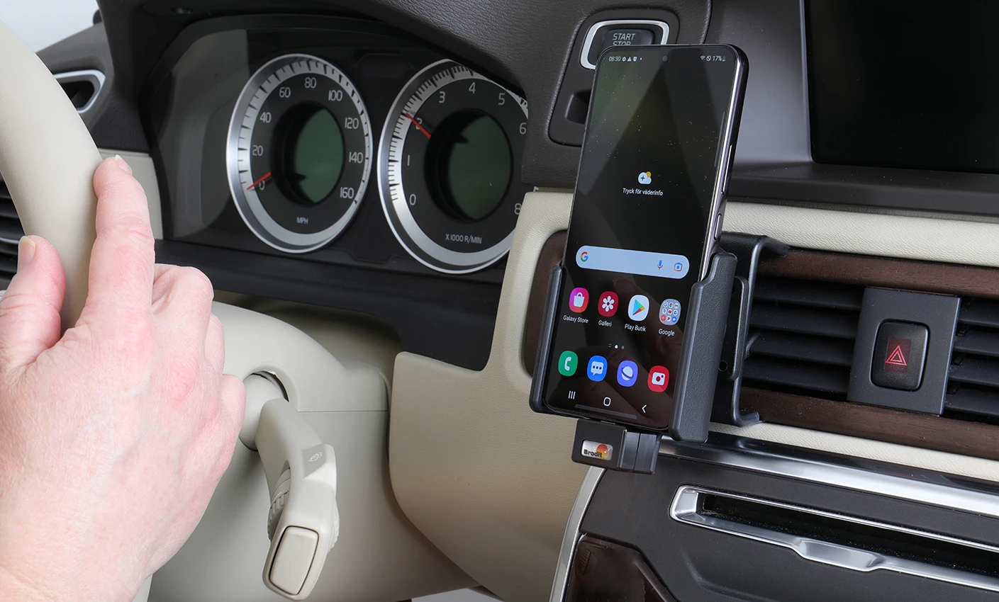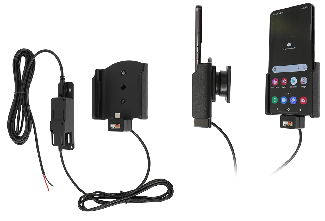 Keep your phone's battery fully charged in an active holder, always within easy sight and reach! Neat, discreet and convenient. Custom made with a perfect, firm fit. For fixed installation. The holder is to be connected inside the dashboard, providing an elegant installation without any cables hanging over the interior. The charging box has two USB-A ports: QC 3.0A + 2.4A. You have full access to the camera and all buttons when the device is in the holder. It is easy to slide the phone in place in the holder so it connects to the charging, and to take it out of the holder when leaving the vehicle.