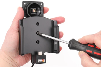 The holder is equipped with a tilt swivel so you can easily adjust the angle for better viewing, or switch between portrait and landscape mode. Tilts 17° and swivels 360°. Mounting plate 42x50 mm with 4 mm AMPS-holes. Made of high grade black ABS/Acetal plastic. Made in Sweden. Connect the power cable with a 2A fuse. Professional installation recommended. Attach onto a ProClip mounting platform.