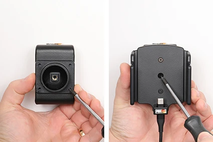 To adjust the holder for your device: Loosen the screws on the front side of the holder, so the sides of the holders can be adjusted. Place the device in the holder and press the sides together so the device is firmly in place. Remove the device carefully without moving the sides. Tighten the screws on the front side of the holder.