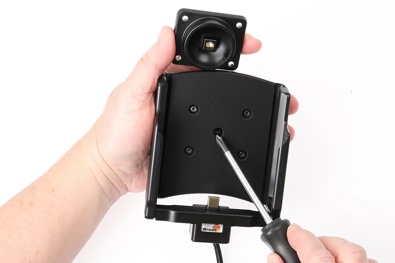 The holder is equipped with a tilt swivel so you can easily adjust the angle for better viewing, or switch between portrait and landscape mode. Tilts 17° and swivels 360°. Mounting plate 42x50 mm with 4 mm AMPS-holes. Made of high grade black ABS/Acetal plastic. Made in Sweden. Connect the power cable with a 2A fuse. Professional installation recommended. Attach onto a ProClip Mounting Platform or a Pedestal Mount.