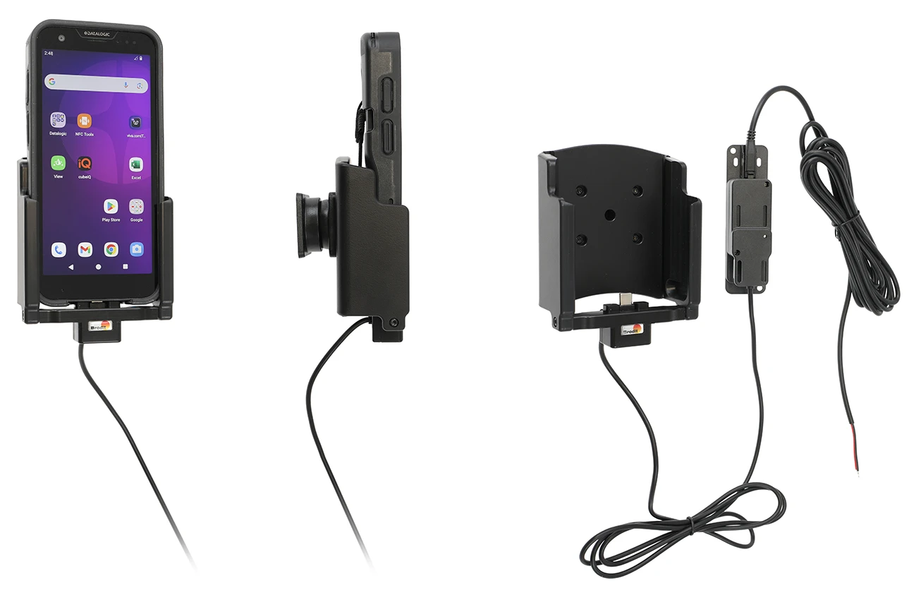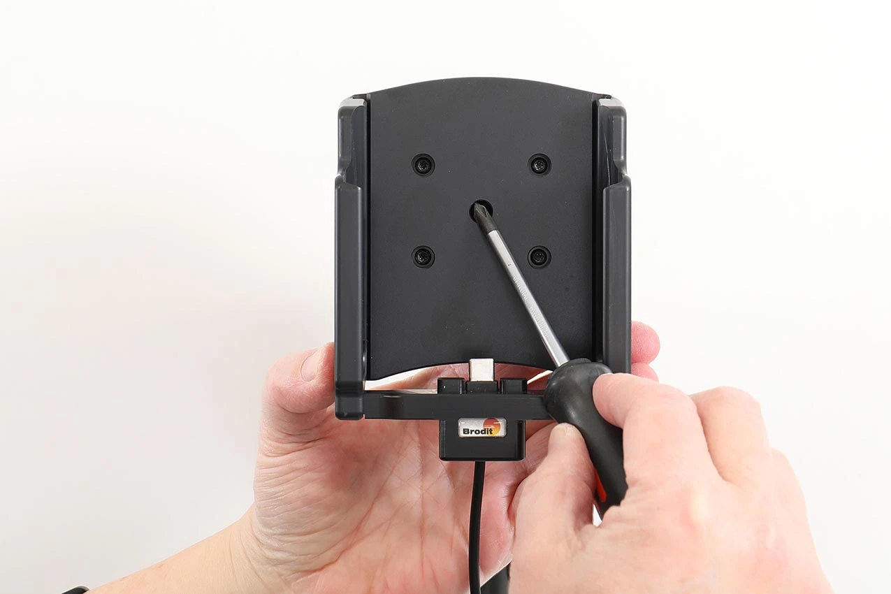 The holder is equipped with a tilt swivel so you can easily adjust the angle for better viewing, or switch between portrait and landscape mode. Tilts 17° and swivels 360°. Mounting plate 42x50 mm with 4 mm AMPS-holes. Made of high grade black ABS/Acetal plastic. Made in Sweden. Connect the power cable with a 2A fuse. Professional installation recommended. Attach onto a ProClip mounting platform.