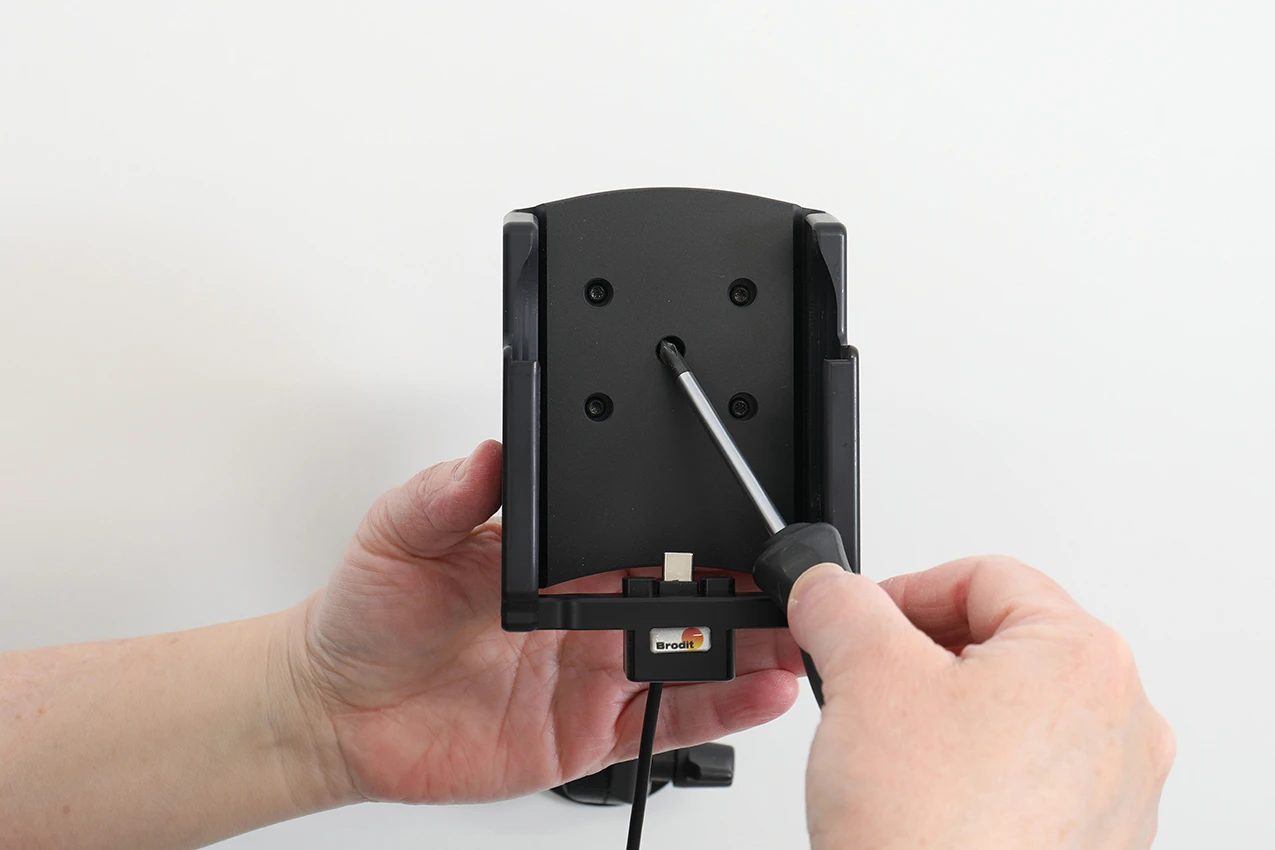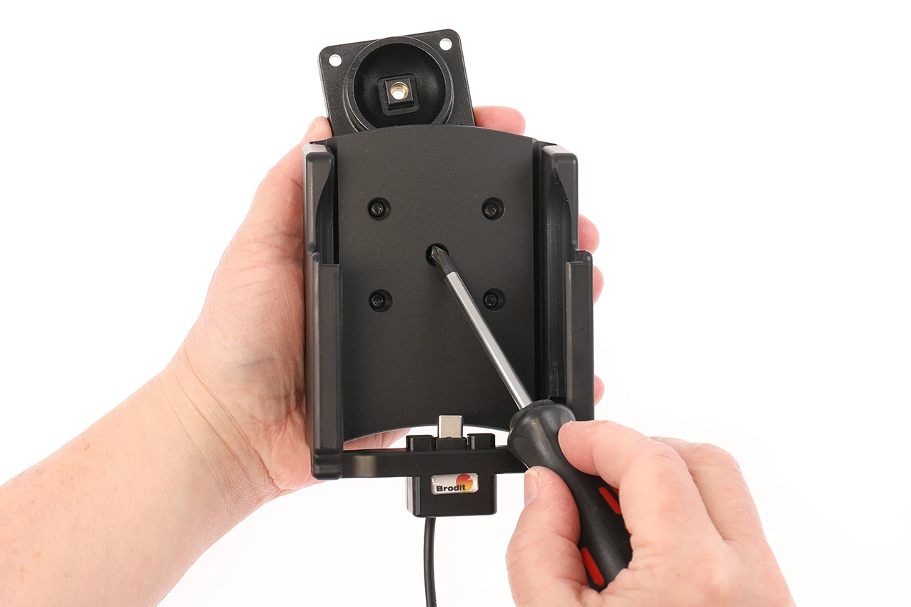 The holder is equipped with a tilt swivel so you can easily adjust the angle for better viewing, or switch between portrait and landscape mode. Tilts 17° and swivels 360°. Mounting plate 42x50 mm with 4 mm AMPS-holes. Made of high grade black ABS/Acetal plastic. Made in Sweden. Connect the power cable with a 2A fuse. Professional installation recommended. Attach onto a ProClip Mounting Platform or a Pedestal Mount.