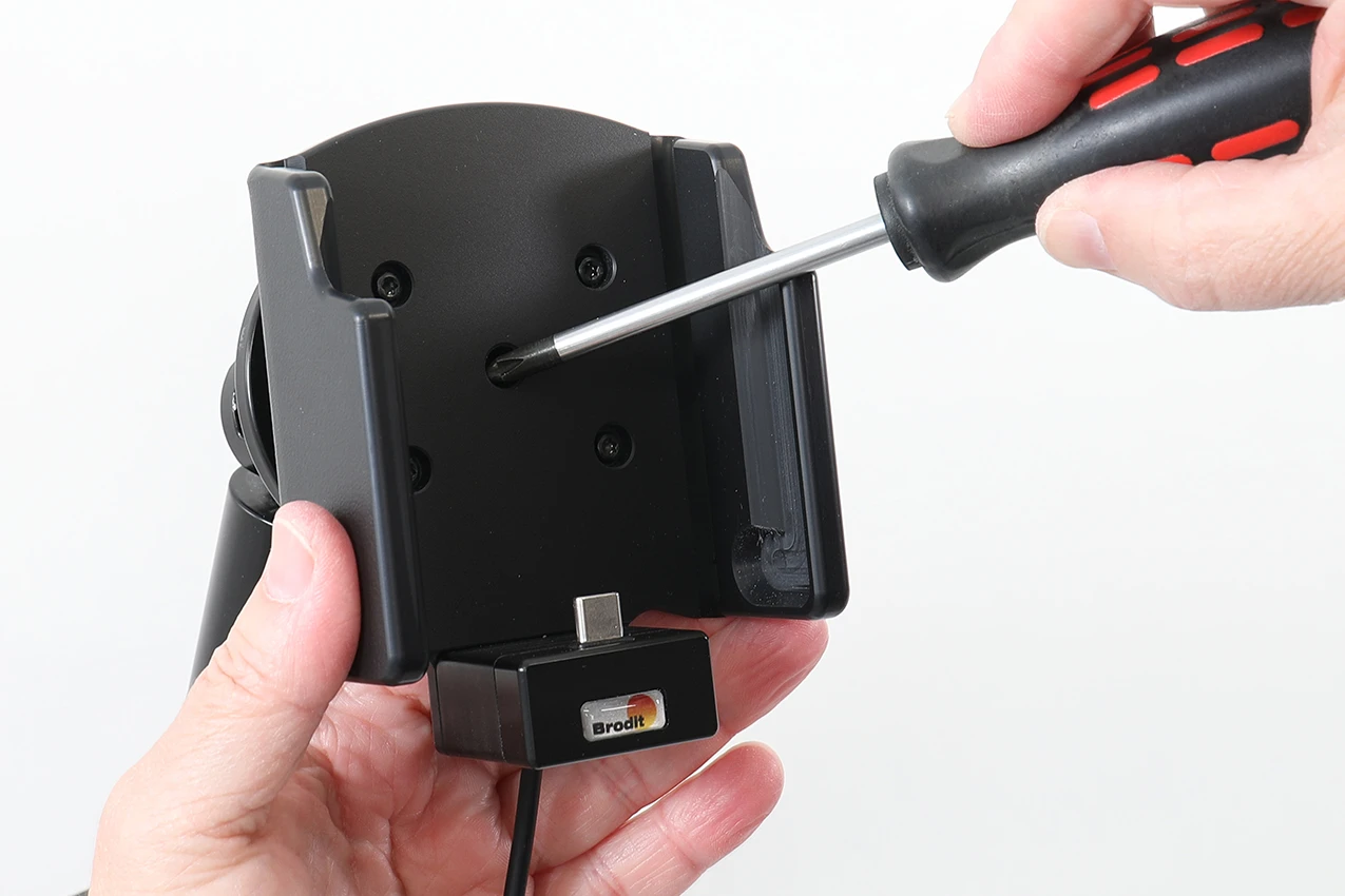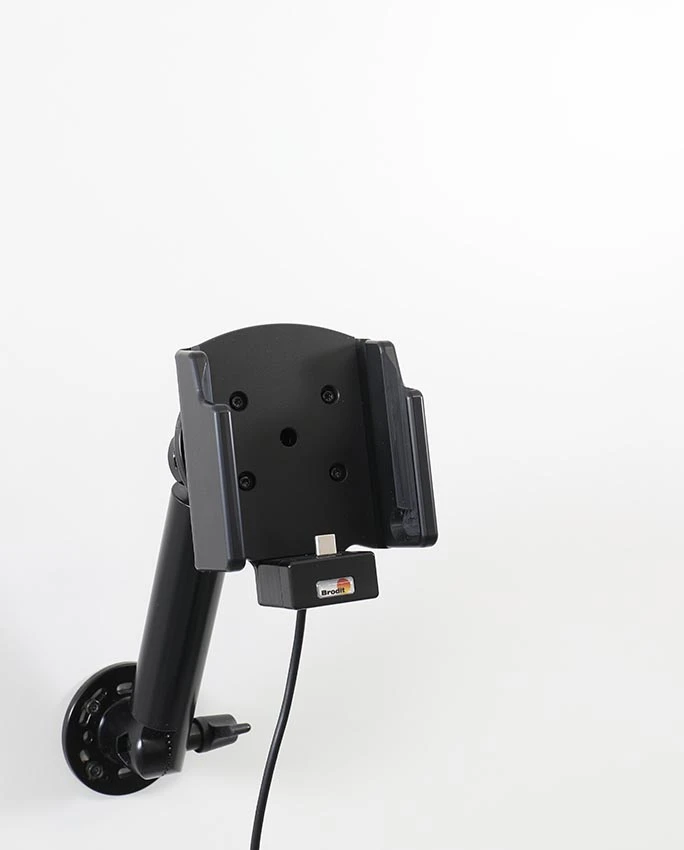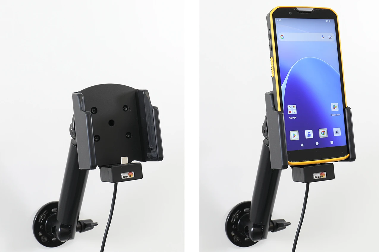 With USB-C cable. 2 USB ports: Type-A and Type-C: QC 3.0A + 2.4A. With tilt swivel. 2.7A charging. 12/24V. For bare device with/without handstrap (not for use with case/skin/boot).