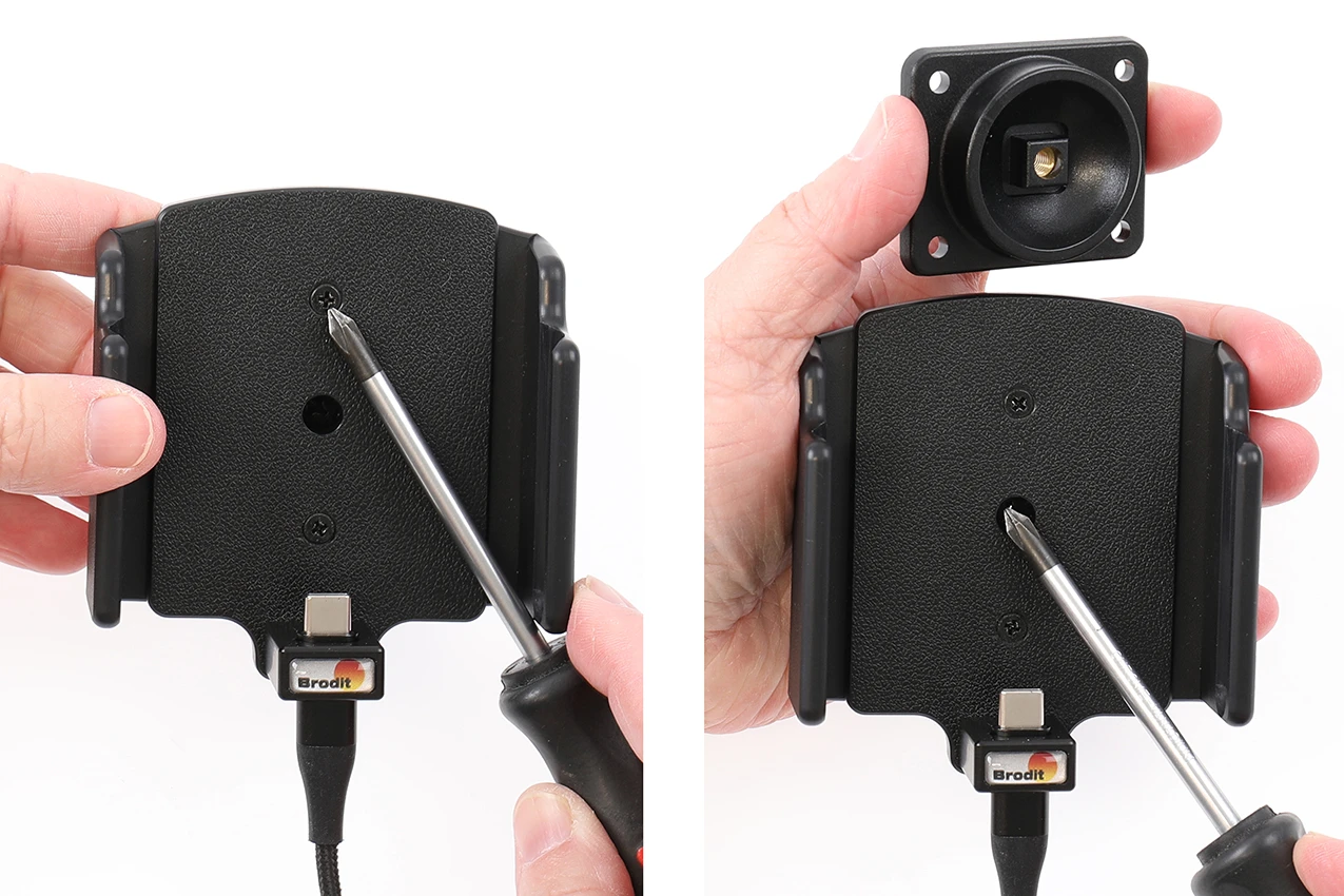To adjust the holder for your device: Loosen the screws on the front side of the holder, so the sides of the holders can be adjusted. Place the device in the holder and press the sides together so the device is firmly in place. Remove the device carefully without moving the sides.