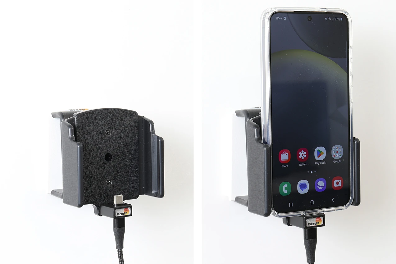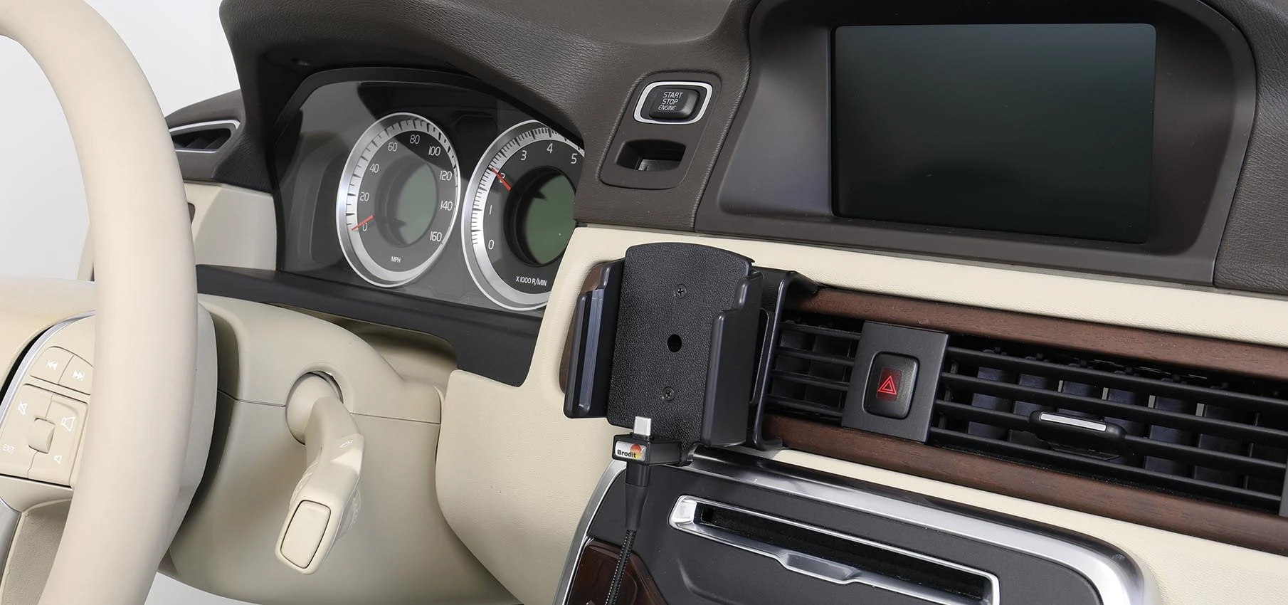 With your mobile in a holder while driving you will always have it within easy sight and reach! And with an active holder you always have a charged battery when leaving the car. Neat, discreet and convenient! For fixed installation. The holder is to be connected inside the dashboard, providing an elegant installation without any cables hanging over the interior. The charging box has two USB ports: Type-A and Type-C. It is easy to slide the device in place in the holder so it connects to the charging, and to take it out of the holder when leaving the vehicle.