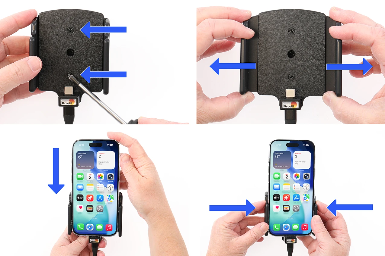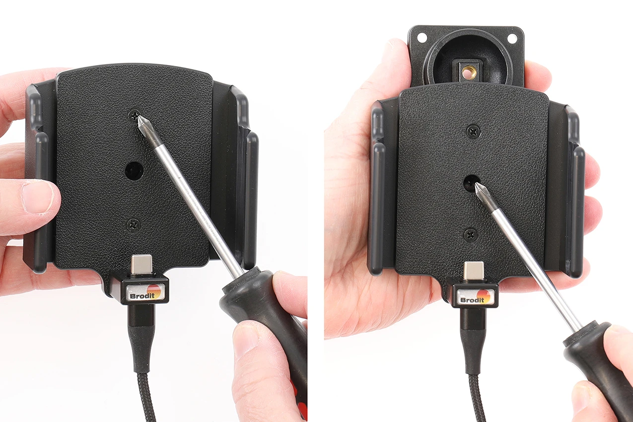 To adjust the holder for your device: Loosen the screws on the front side of the holder, so the sides of the holders can be adjusted. Place the device in the holder and press the sides together so the device is firmly in place. Remove the device carefully without moving the sides.