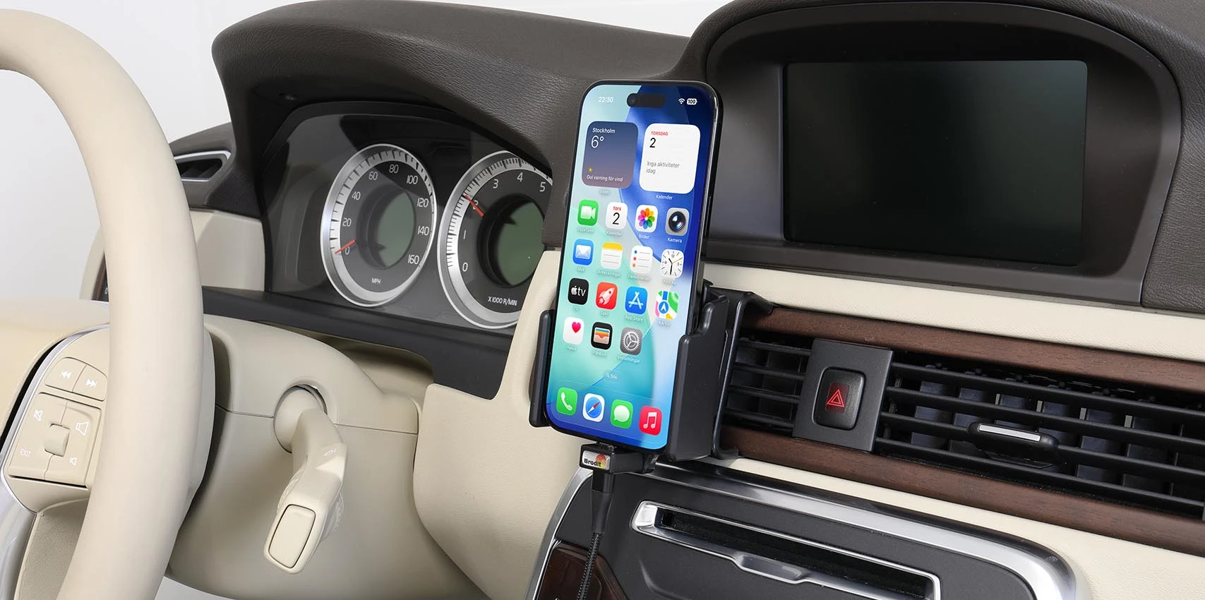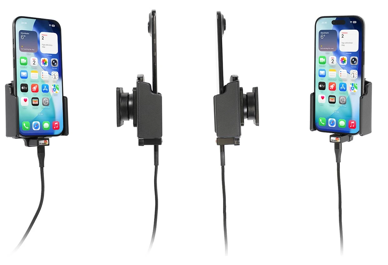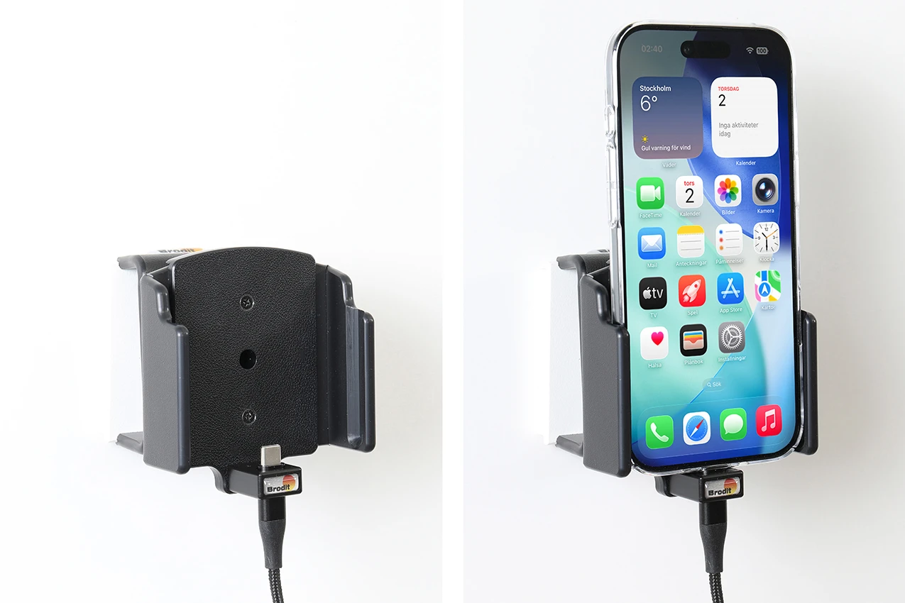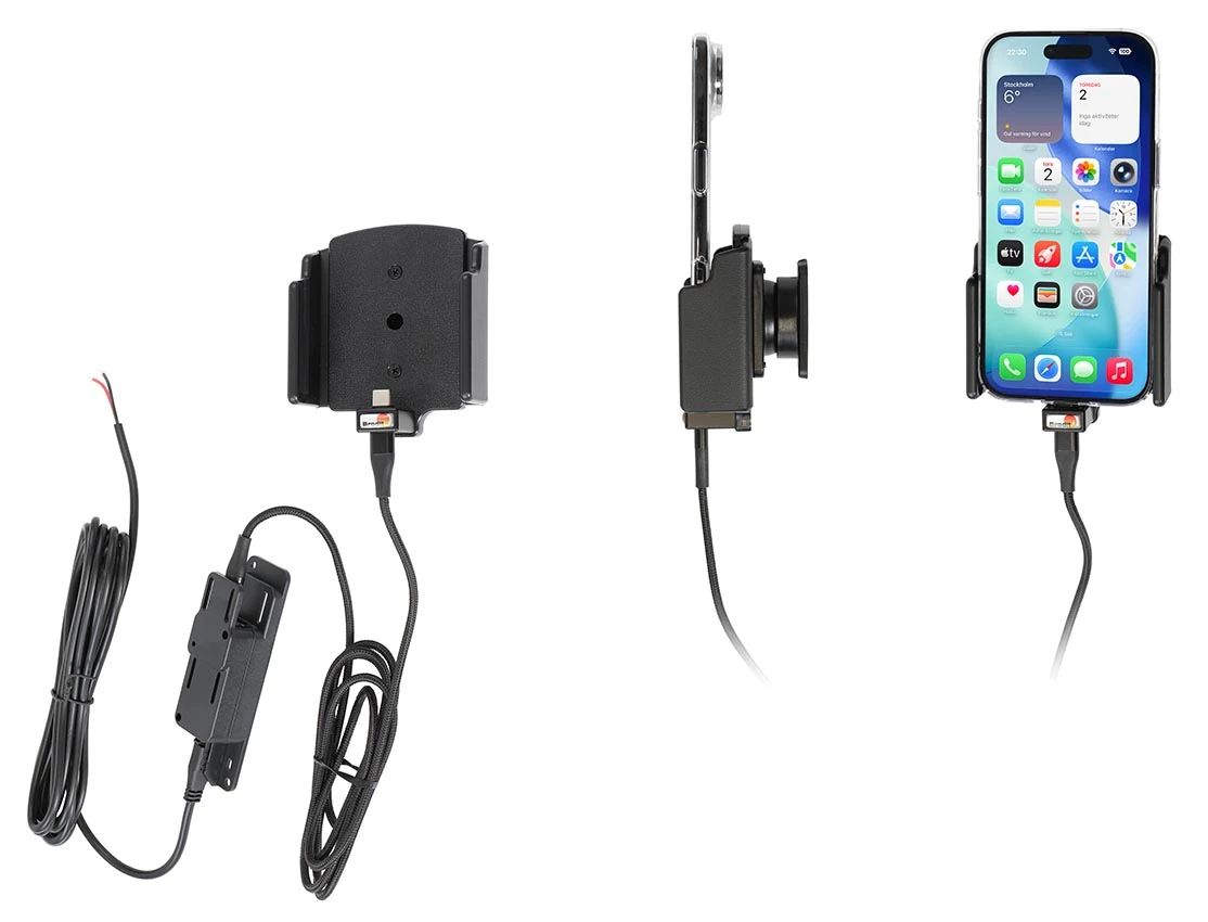 With your mobile in a holder while driving you will always have it within easy sight and reach! And with an active holder you always have a charged battery when leaving the car. Neat, discreet and convenient! For fixed installation. The holder is to be connected inside the dashboard, providing an elegant installation without any cables hanging over the interior. The charging box has two USB ports: Type-A and Type-C. It is easy to slide the device in place in the holder so it connects to the charging, and to take it out of the holder when leaving the vehicle.