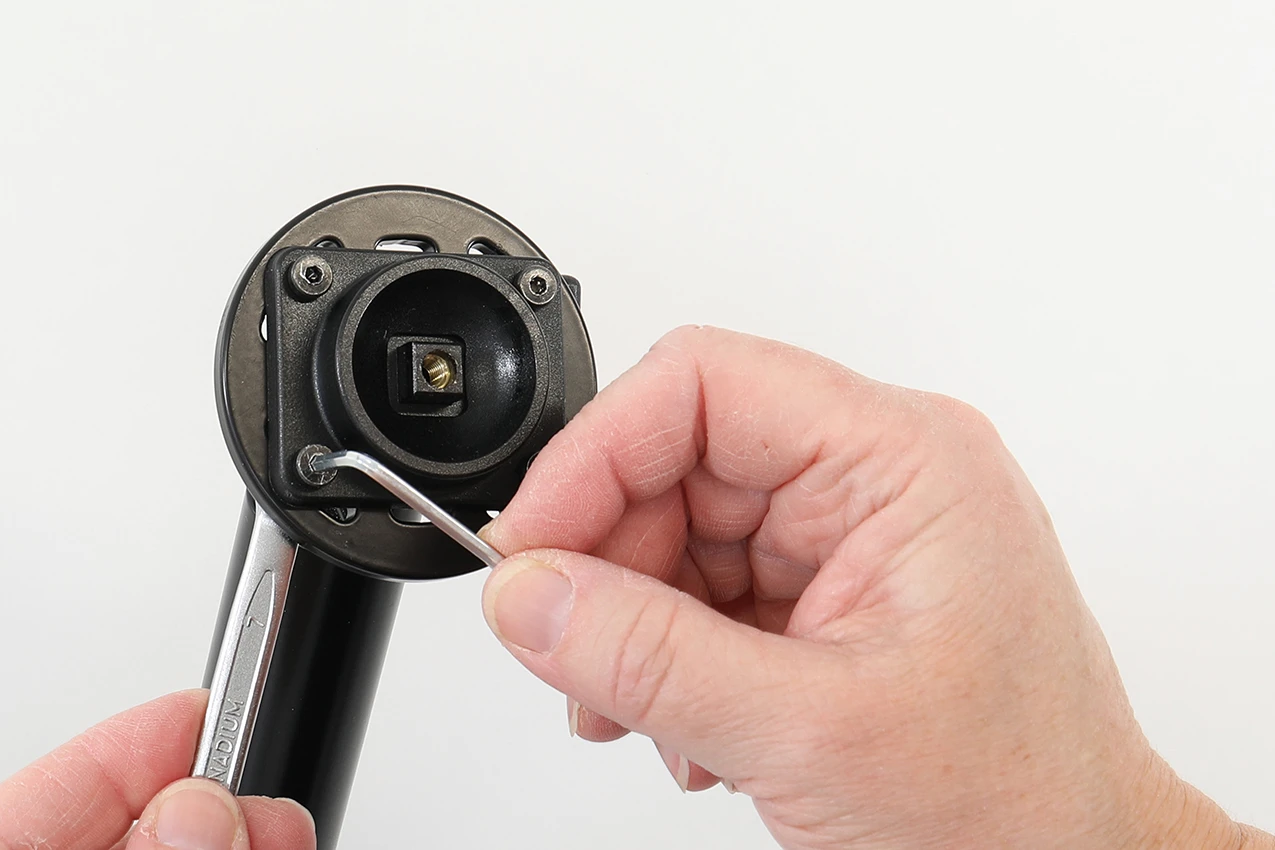 Place the holder over the attaching plate so the screw fits in the hole in the tilt swivel and screw it into place. Tighten the screw so the holder is firmly in place, but still can be adjusted.