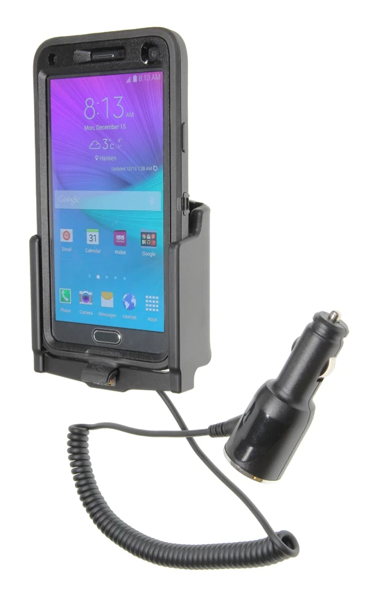 The active holder charges your Galaxy Note 4 when it is in the holder. The holder is attached onto a tilt swivel and can be adjusted in order to avoid light reflection. Connects to the vehicle’s cigarette lighter socket, 12/24 Volt. Attach onto a ProClip Mounting Platform.