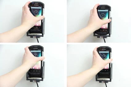 To place the device in the holder: Place the bottom part of the device into the holder. Press the top of the device forward and in the same time slide the device downward into place in the holder. To remove the device from the holder: Press the upper part of the holder forward. When the device is set free, lift it upward out of the holder.
