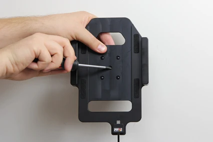 Place the holder over the attaching plate so the screw fits in the hole in the tilt swivel. Tighten the screw until the holder is firmly in place, but still can be adjusted.Slide the device sideways into the holder until you hear / feel it snaps into place.