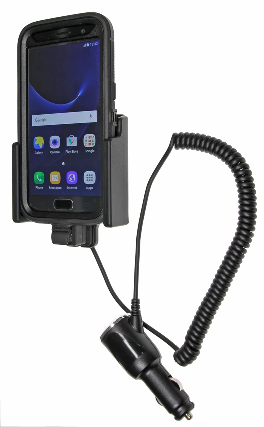 The active holder charges your Galaxy S7 when it is in the holder. The holder is attached onto a tilt swivel and can be adjusted in order to avoid light reflection. Connects to the vehicle’s cigarette lighter socket, 12/24 Volt. Attach onto a ProClip Mounting Platform.