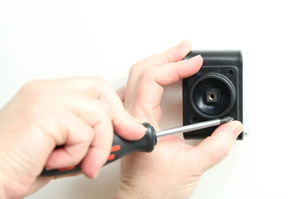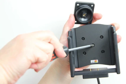 Place the holder over the attaching plate so the screw fits in the hole in the tilt swivel. Tighten the screw firm at first, then loosen it a bit so the holder is firmly in place, but still can be adjusted.