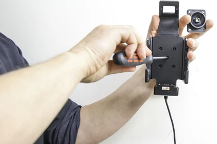 Place the attaching plate onto the desired position. Screw the attaching plate into place with the enclosed screws. Place the holder over the attaching plate so the screw fits in the hole in the tilt swivel. Tighten the screw so the holder is firmly in place, but still can be adjusted.