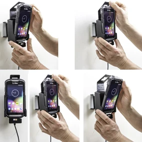 To place the device in the holder: Place the bottom part of the device into the holder. Press the top of the device forward and in the same time slide the device downward into place in the holder. To remove the device from the holder: Press the upper part of the holder forward. When the device is set free, lift it upward out of the holder.