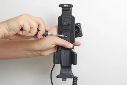 To place the device in the holder: Place the upper part of the device in the holder, then flip/press the lower part forwards so it snaps into place in the holder. To remove the device from the holder: Press upwards on the upper part of the holder, in the same time pull the upper part of the device out from the holder and then lift the device up and out from the holder.